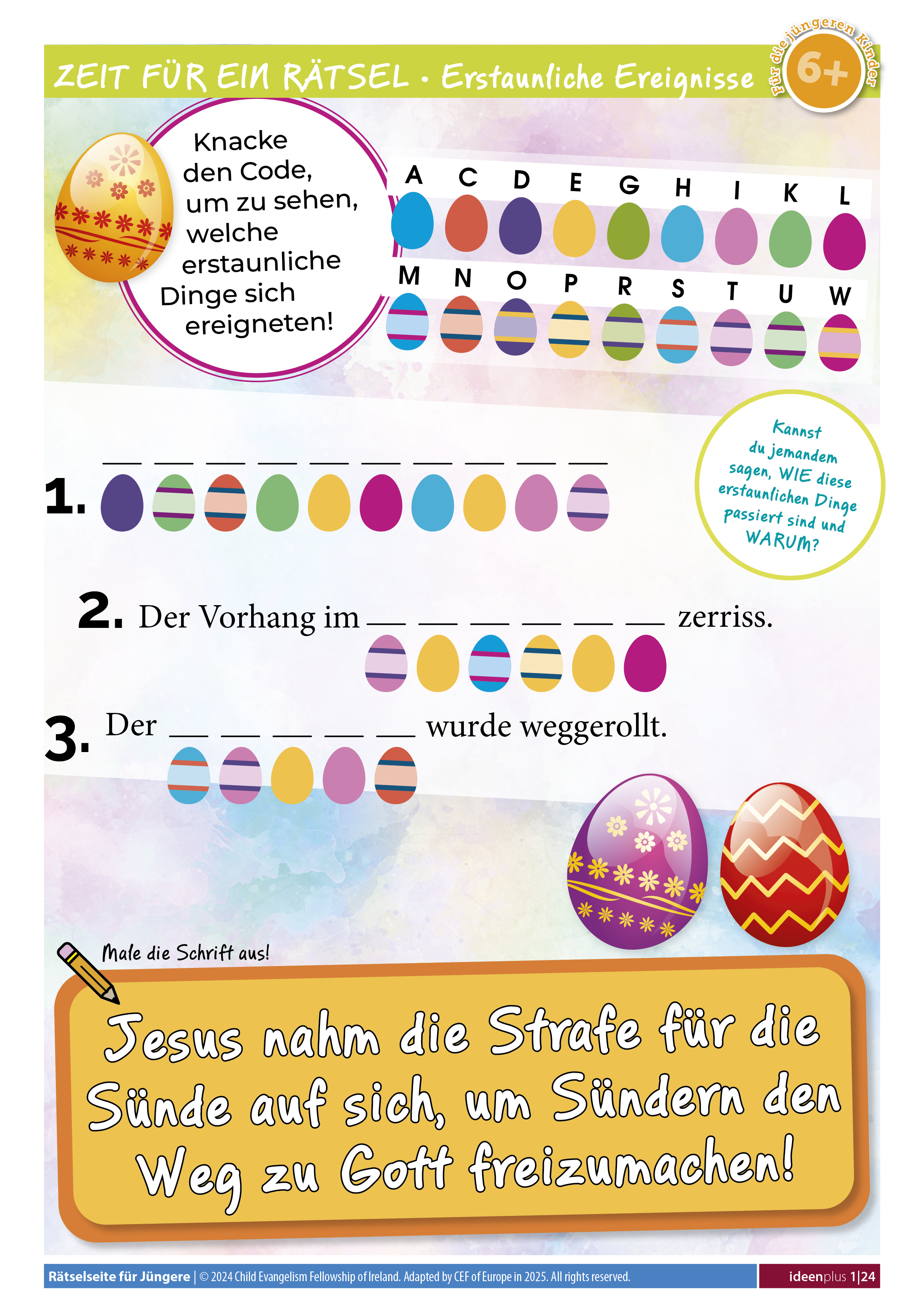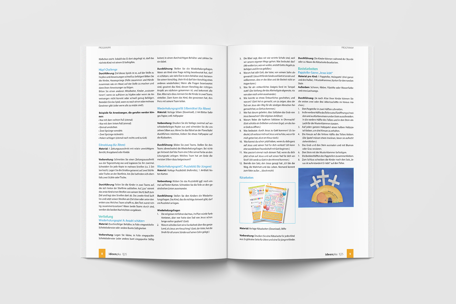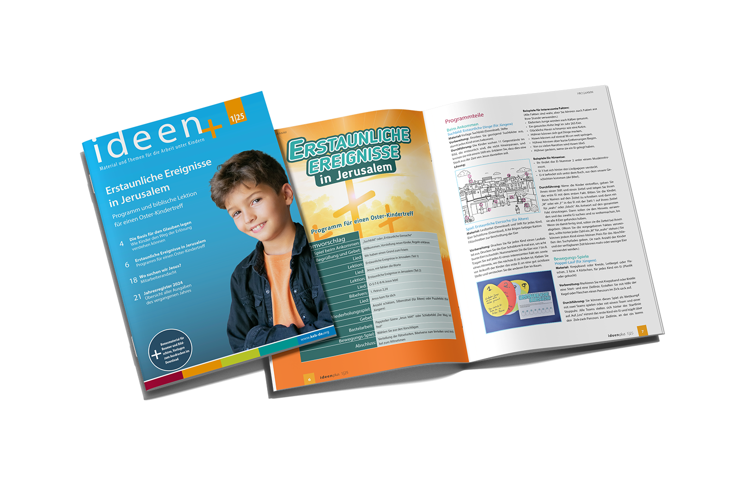 Die neue Ausgabe von ideenplus hilft dabei, die biblische Ostergeschichte lebendig und verständlich zu vermitteln. Die tiefgehende biblische Lektion „Erstaunliche Ereignisse in Jerusalem“ wird durch ansprechende Bilderunterstützt und lässt Kinder staunen. Ein durchdachtes Programm für einen Oster-Kindertreff bietet umfangreiches Material für eine abwechslungsreiche Oster-Kinderstunde – ideal für Kindertreffs, Sonntagsschulen und Kindergottesdienste. Der Bibelvers zum Lernen aus 1. Petrus 2,24 hilft Kindern zu verstehen, was Jesus für sie getan hat.