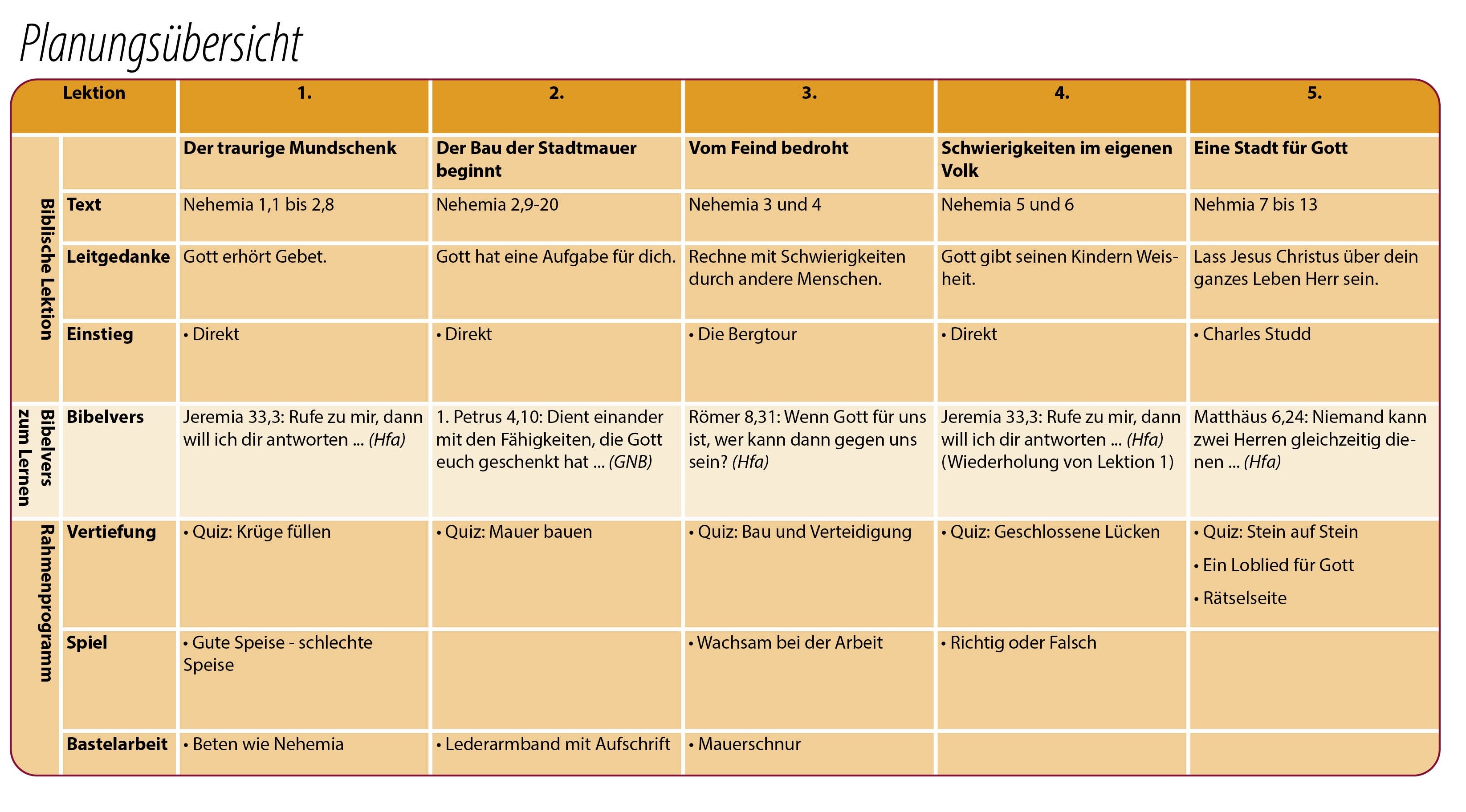 Diese fünf Lektionen, - Der traurige Mundschenk - Der Bau der Stadtmauer beginnt - Von Feinden bedroht - Schwierigkeiten im eigenen Volk - Eine Stadt für Gott -, vermitteln einen Eindruck, was Gott durch einen Einzelnen tun kann, der ihm vertraut und gehorcht.